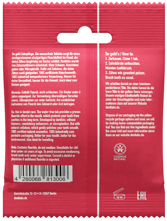 De tandpasta tabletten zijn speciaal ontwikkeld voor het hele gezin. Ze hebben een milde aardbeiensmaak, 100% natuurlijke ingrediënten en een verlaagd, aangepast fluoridegehalte van 500 ppm. De watervrije, vegan formule polijst de tanden op milde wijze, wat resulteert in een gladder oppervlak dat niet langer een goede ondergrond vormt voor bacteriën en tandplak om aan te vallen.