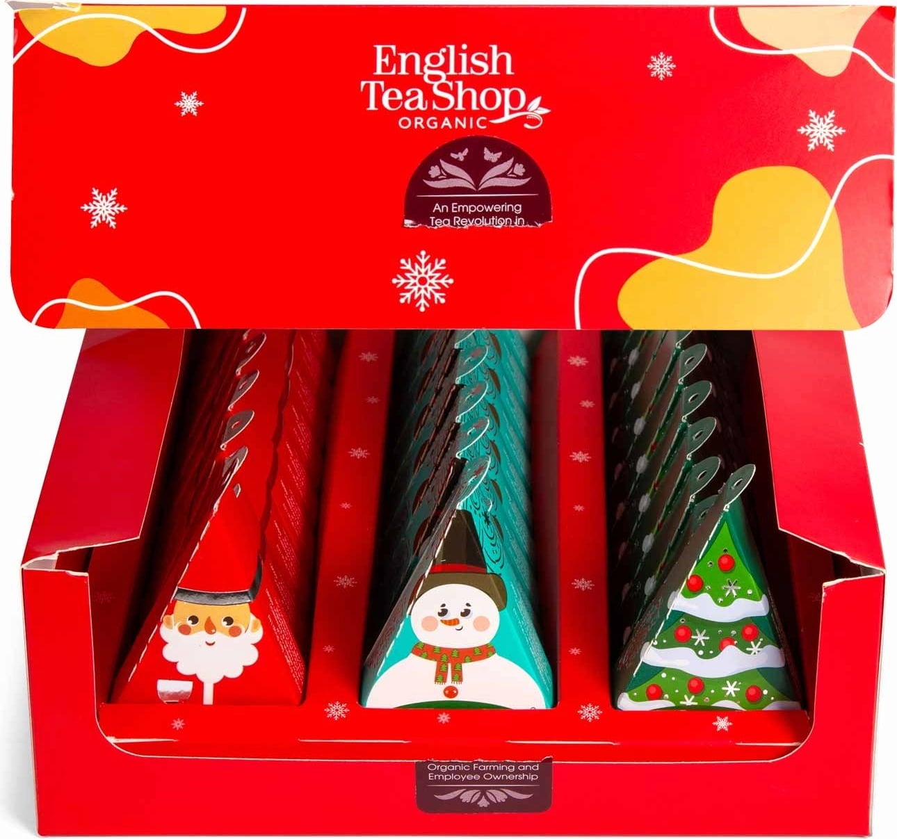 Deze feestelijke display van English Tea Shop bevat 3 x 10 verschillende kerstontwerpen, waaronder de kerstman, een sneeuwpop en kerstboom. De prachtig vormgegeven individuele verpakking bevat de volgende heerlijke biologische theesoorten: