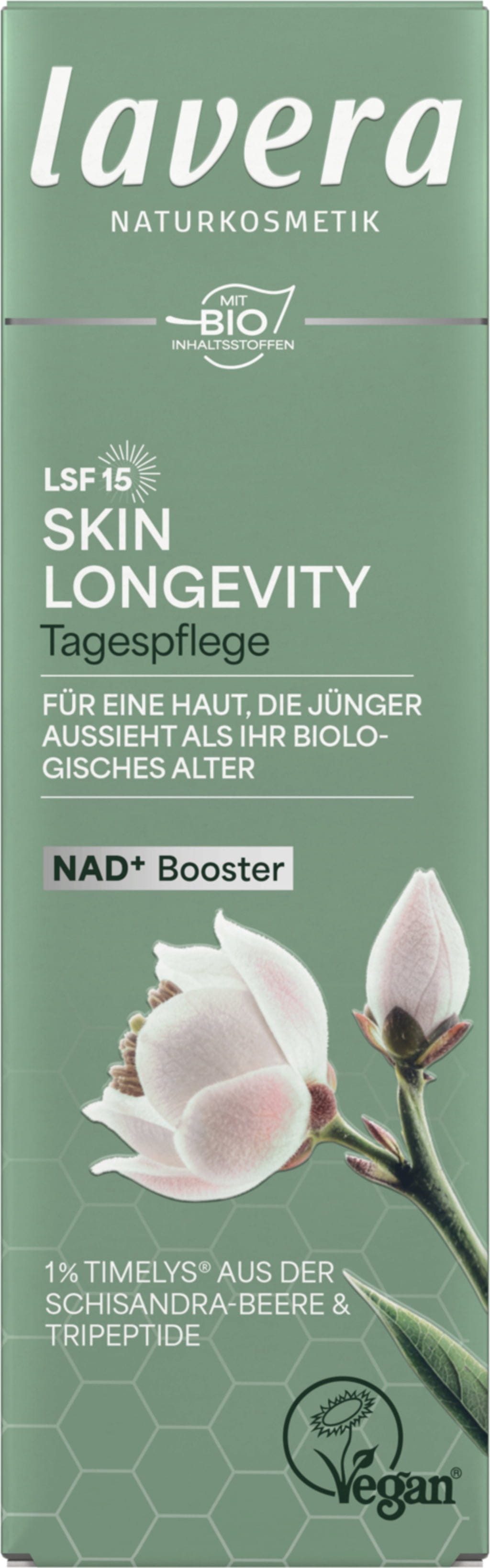 Dankzij de innovatieve combinatie van NAD+-boosters uit liposomaal ingekapseld NMN (nicotinamide mononucleotide), tripeptiden en TIMELYS® uit Schisandra-bessen, biedt Skin Longevity Dagverzorging SPF 15 optimale huidverzorging tegen huidveroudering. Aangevuld met lichte UV-bescherming, is het doel de levensduur van de huid op cellulair niveau te ondersteunen, de huid glad te maken en te zorgen voor een stralende teint en blijvende elasticiteit.