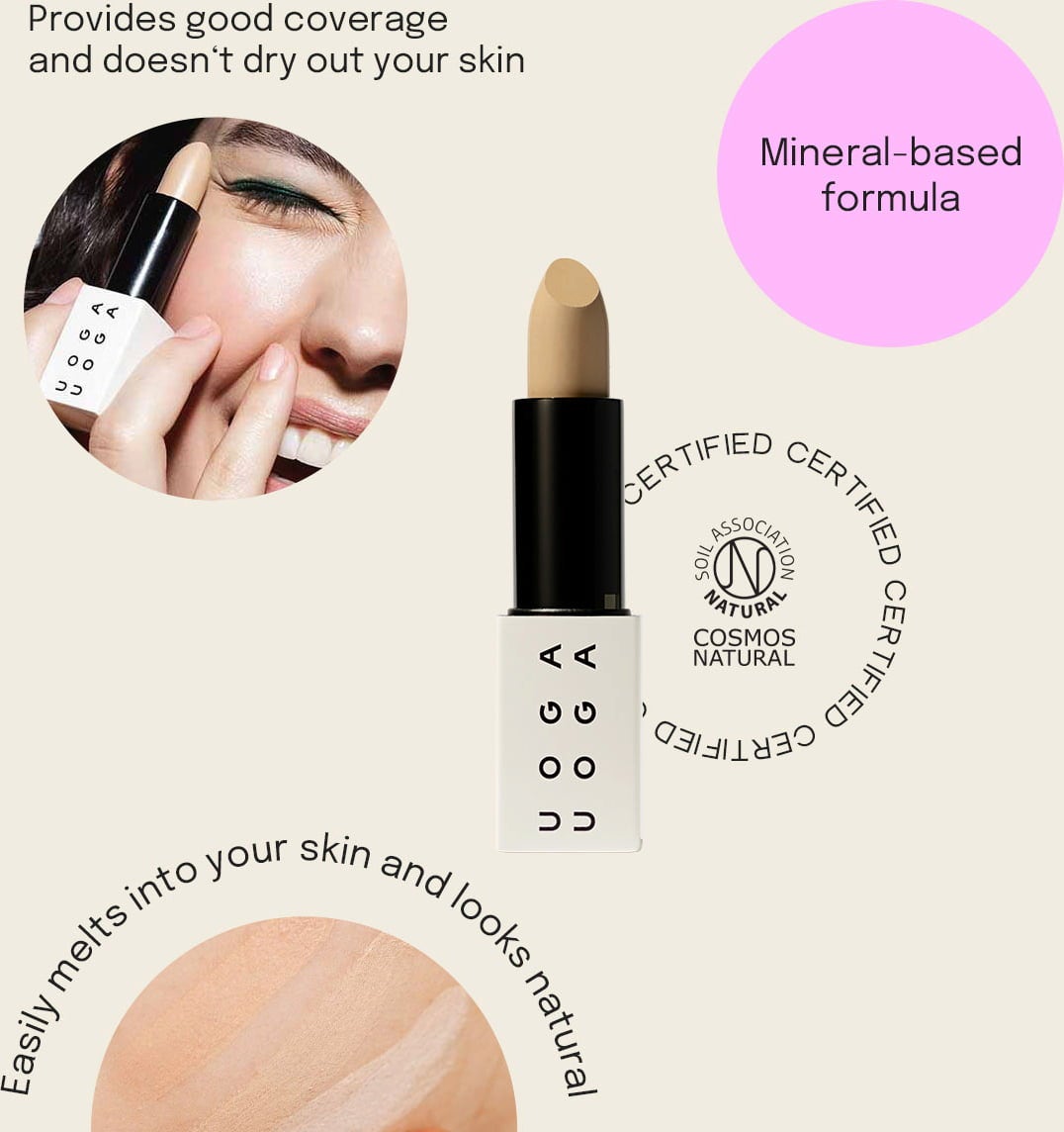 Deze concealer bevat een verbeterde formule van uoga uoga met een zachtere textuur die gemakkelijk te gebruiken is. Het biedt een uitstekende dekking met een matte afwerking. De verschillende tinten verbergen vlekken en imperfectie.